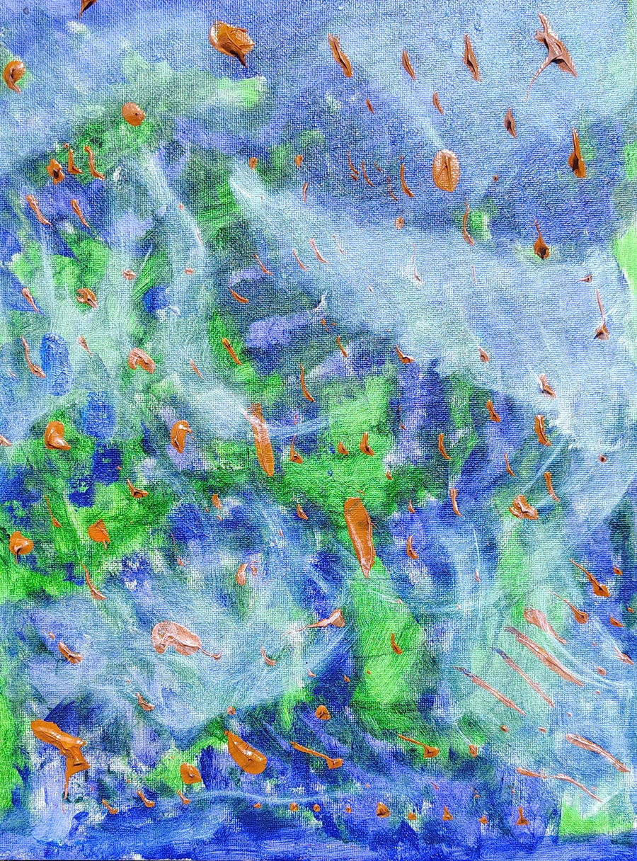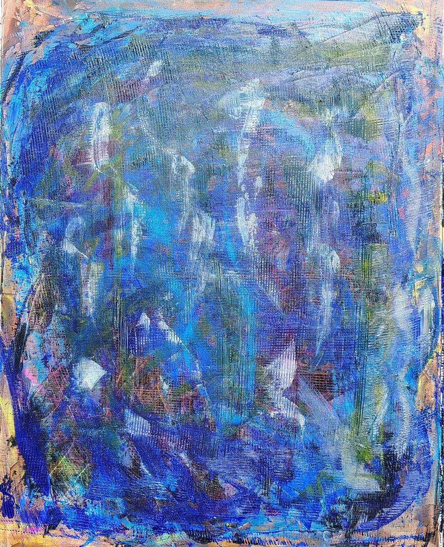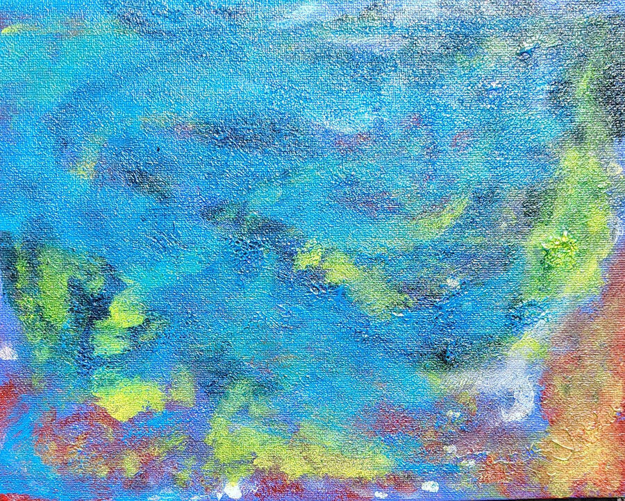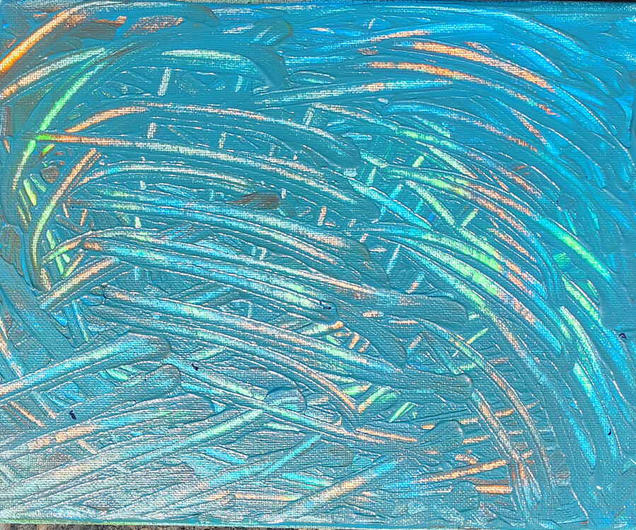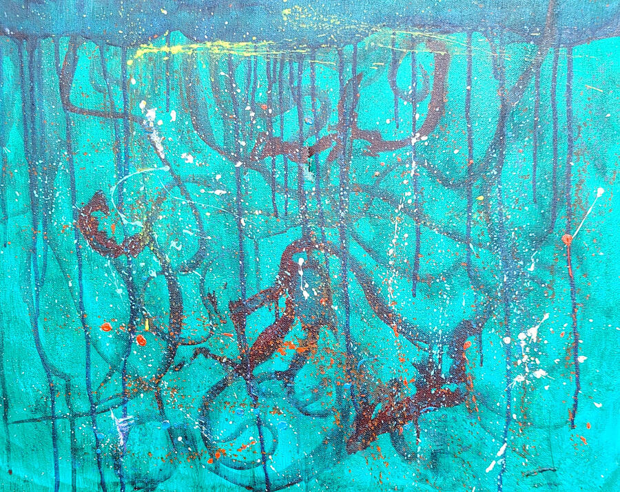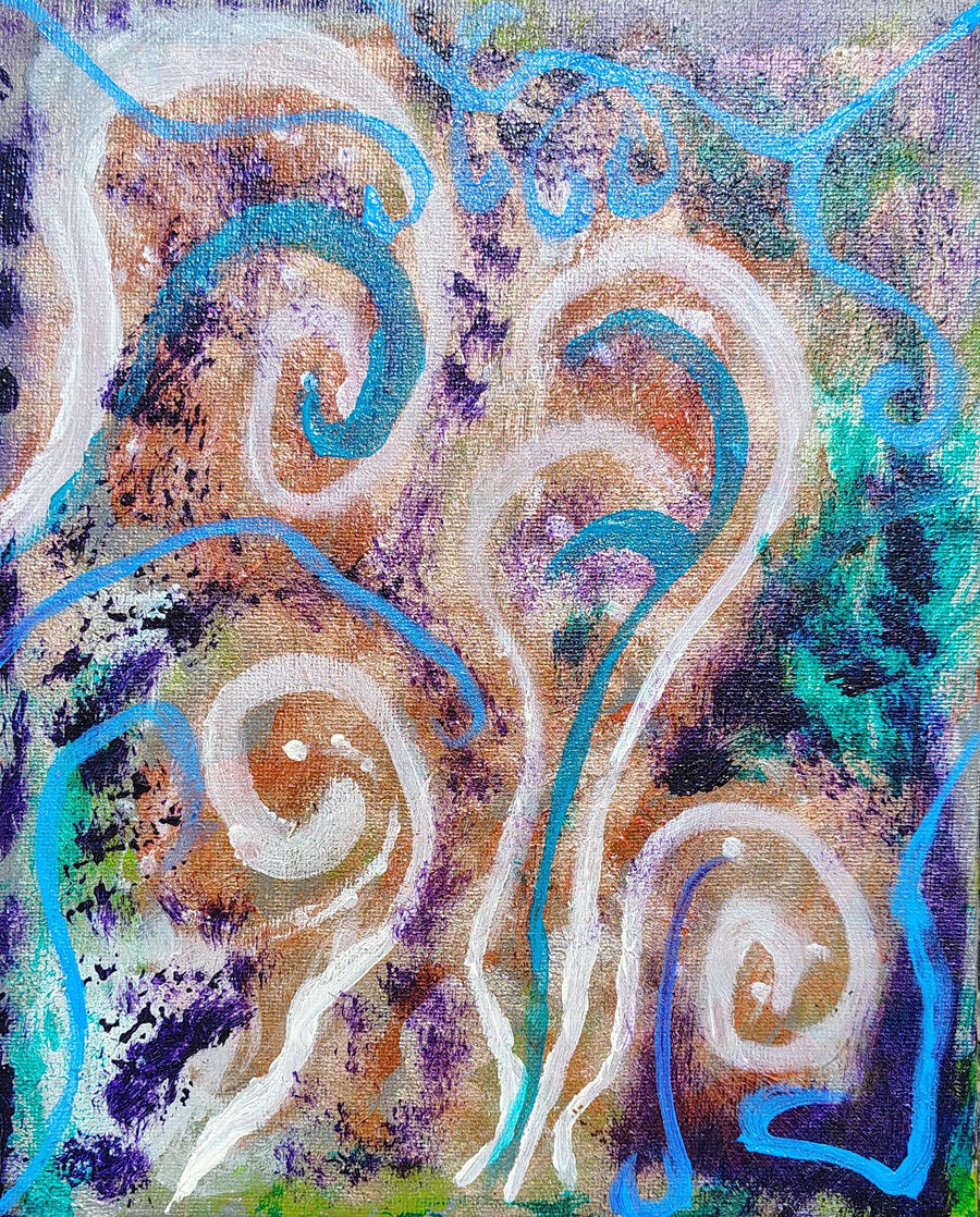 Swirling tendrils of turquoise and ivory dance across a textured field of bronze and plum—