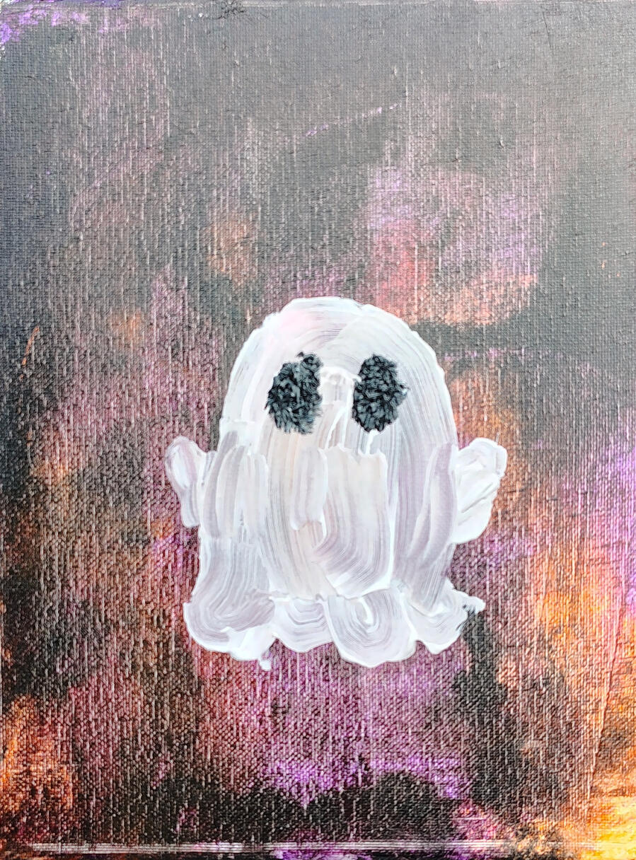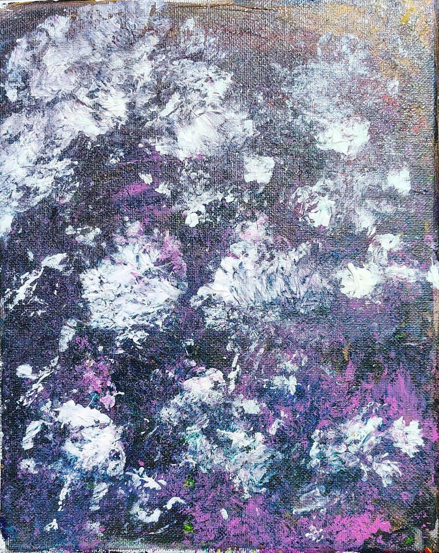 painted in thick, swirling white atop a smoky field of violet and ember.