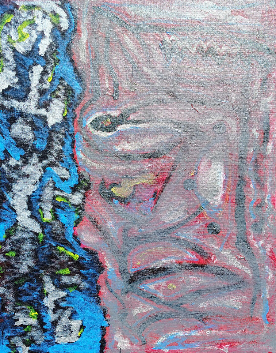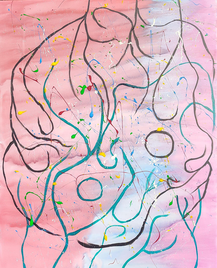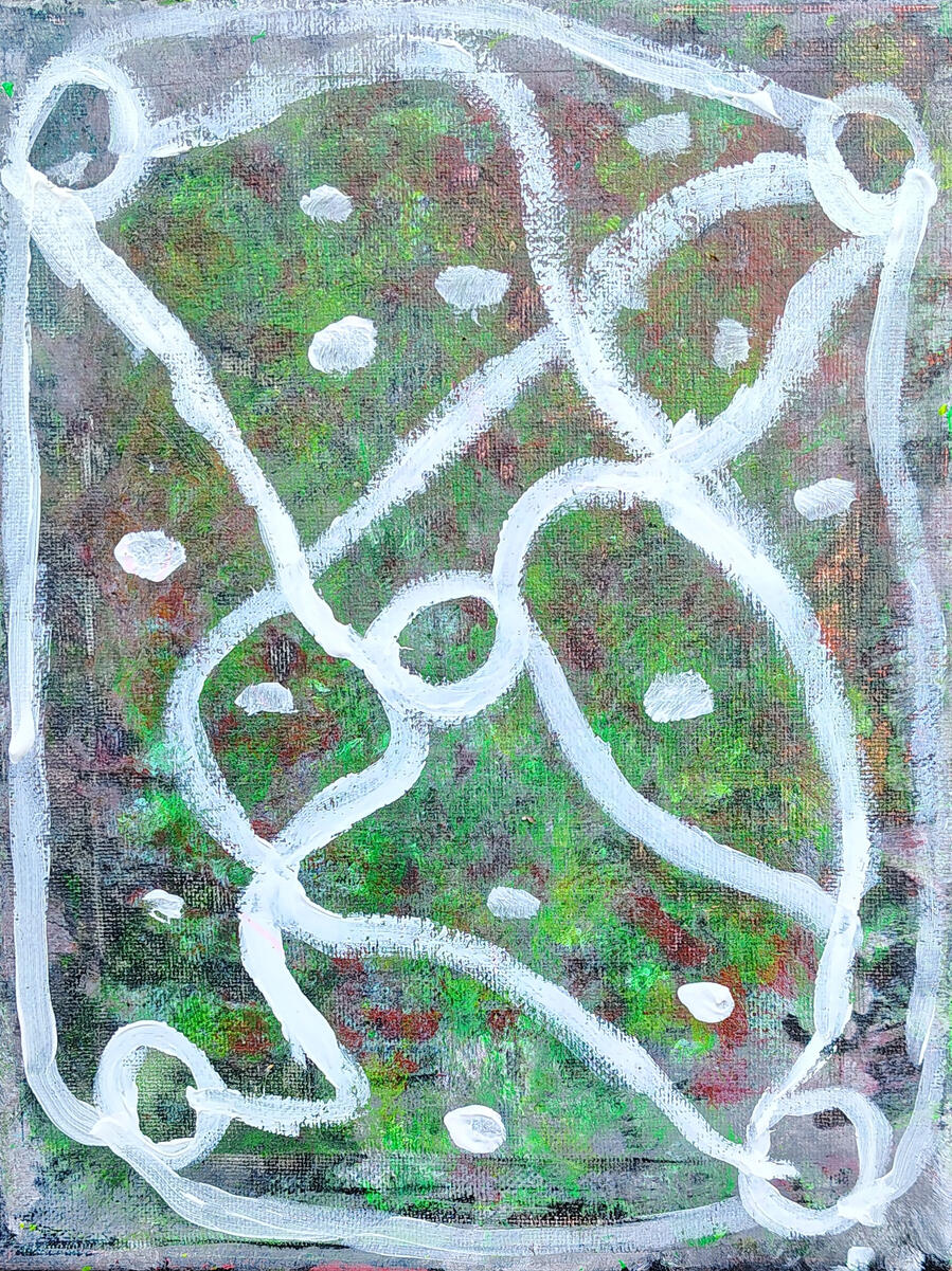 White lines curl and loop across a textured field of green, crimson, and violet—