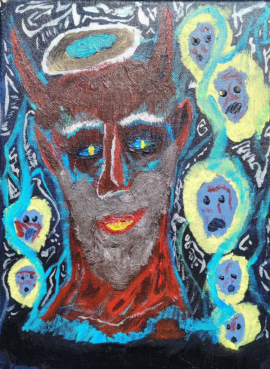 Surrounding it, ghostly faces drift in yellow-green auras—