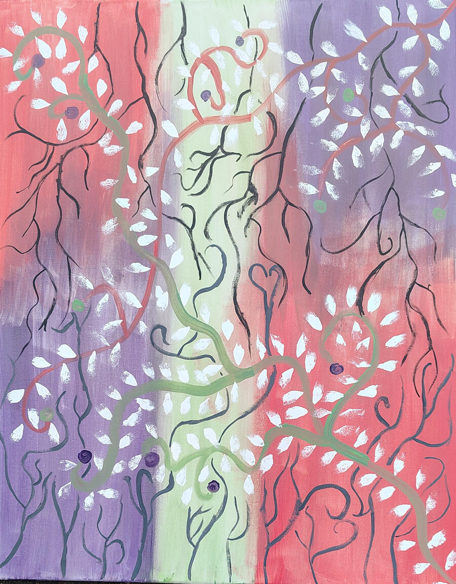 Vines twist across a tri-toned field—purple, red, and pale green—