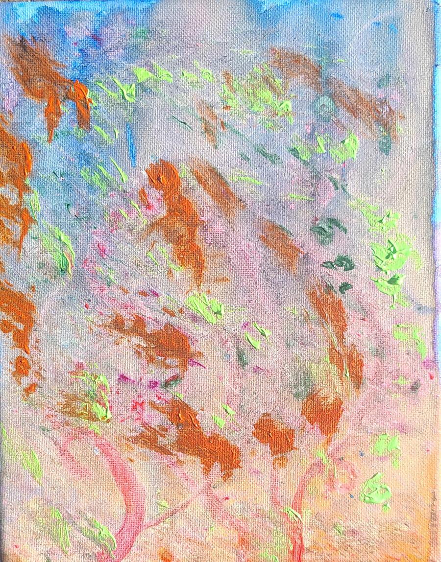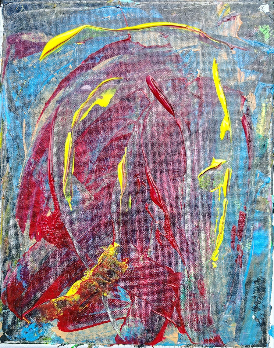 as if the canvas itself were cracking open to release its fire.Hints of green and brown linger at the edges,